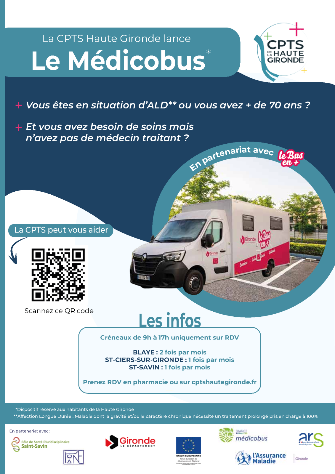 Depuis le 5 mai 2025, un Médicobus sillonne les routes de la Haute-Gironde dans le cadre d'un nouveau partenariat entre la Communauté Professionnelle Territoriale de Santé (CPTS) de la Haute-Gironde, l'ARS Nouvelle-Aquitaine, le Département de la Gironde et la CPAM de la Gironde.