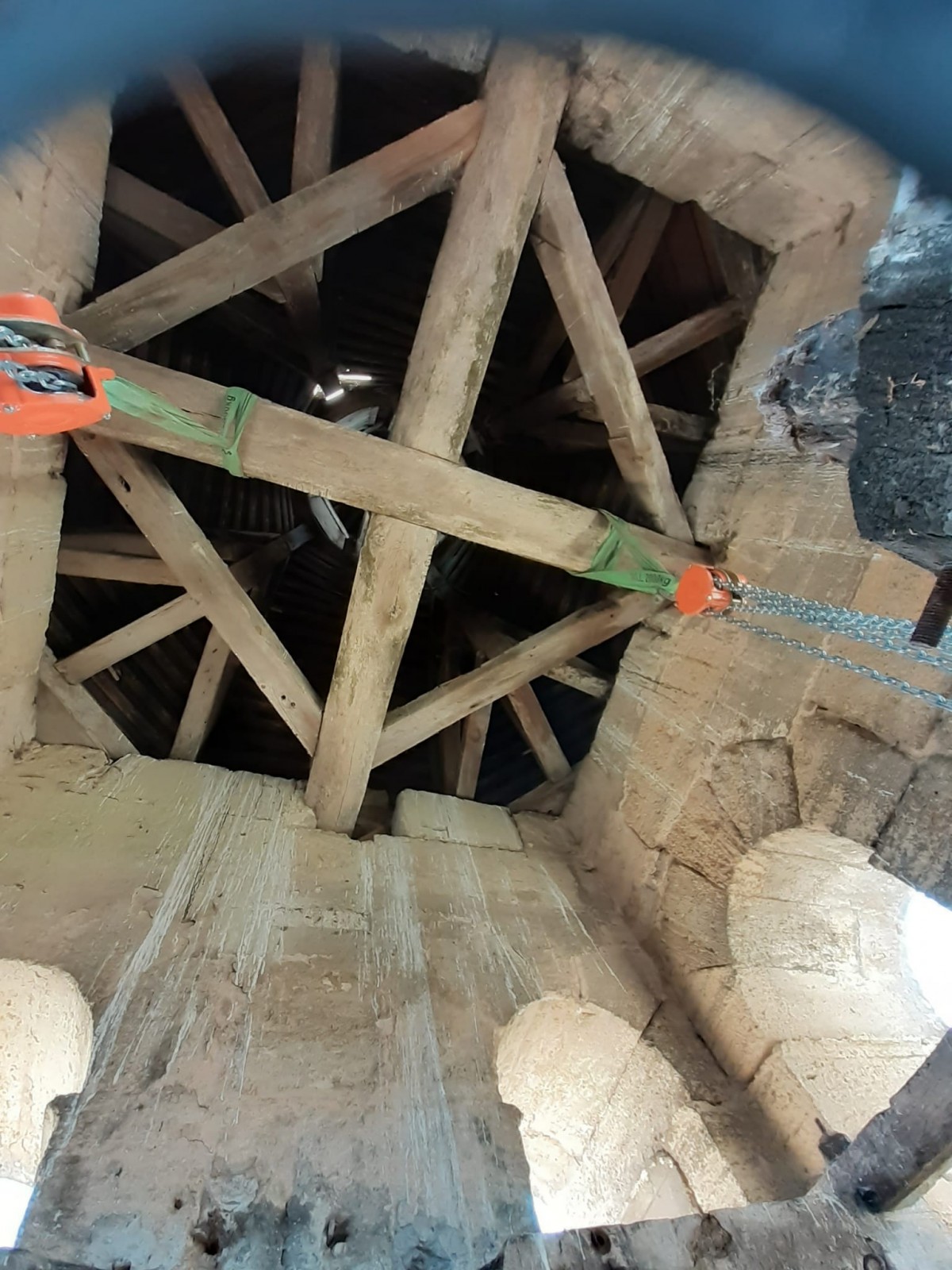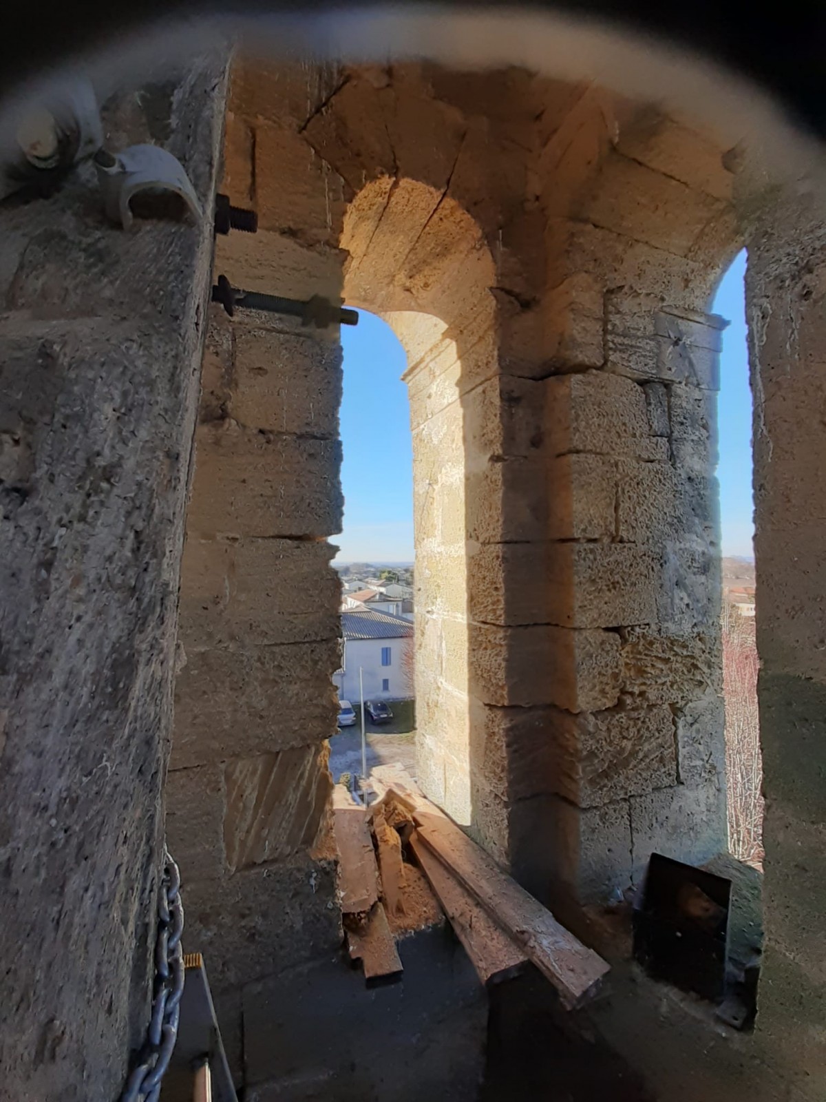Travaux commencés à l église Saint Julien de Cubzac. Le beffroi est déposé avant un remontage et la pose d'abat-sons